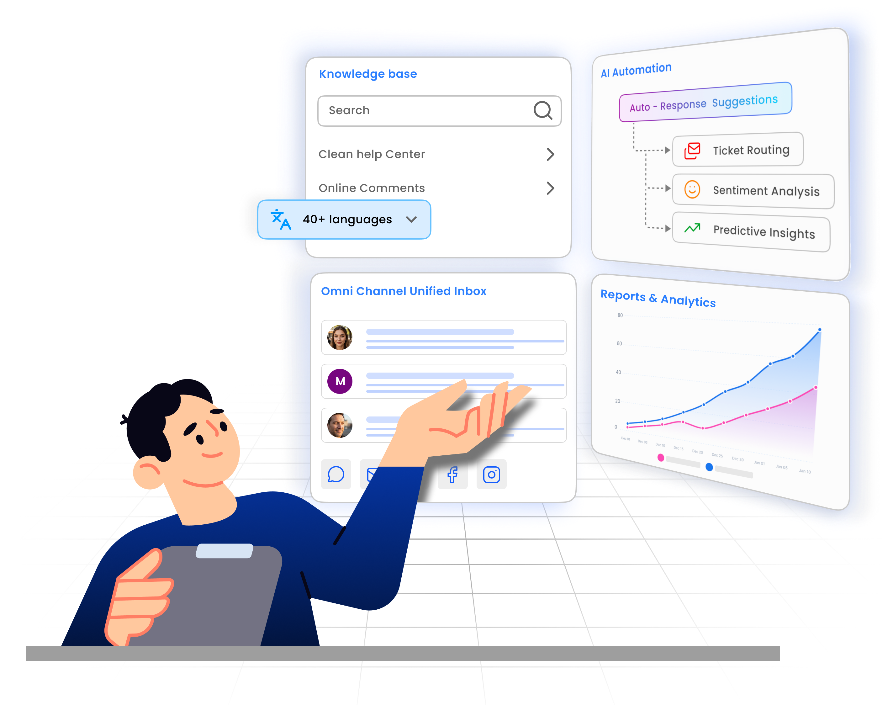 Let AI handle repetitive work. Auto-responses, ticket routing, sentiment analysis, and predictive intelligence built in.