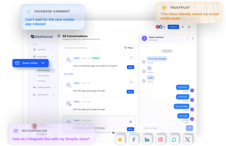 Manage comments, mentions, DMs, and reviews from all social platforms in a single inbox.